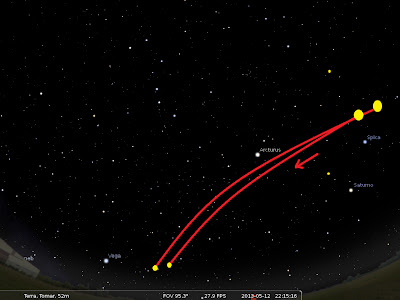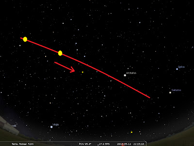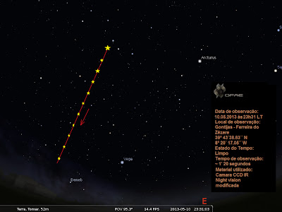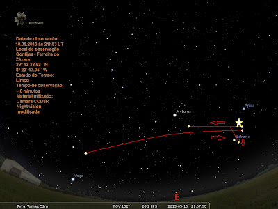 Como nos dias anteriores, foi registado de novo um objecto entre Saturno e Spica. Este objecto estacionário, pelo que pude ver pelas anteriores observações, emite uma série de flashs apenas à aproximação de outros objectos. Não poderei dizer do que se trata, mas tudo o que posso dizer, é que se encontra no espaço e não segue a rotação da Terra.