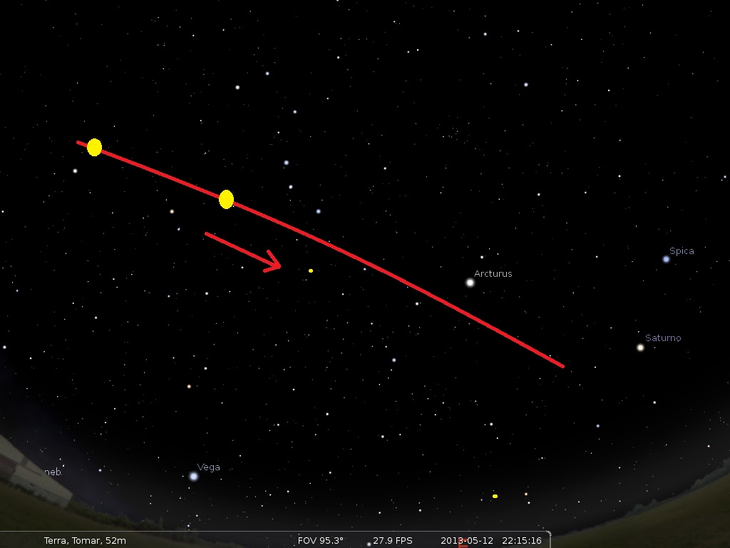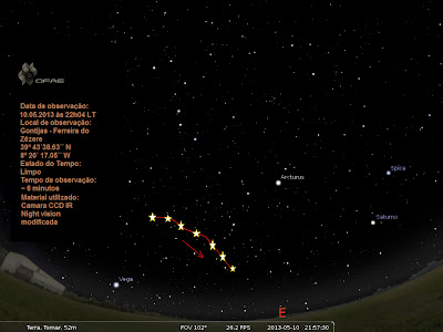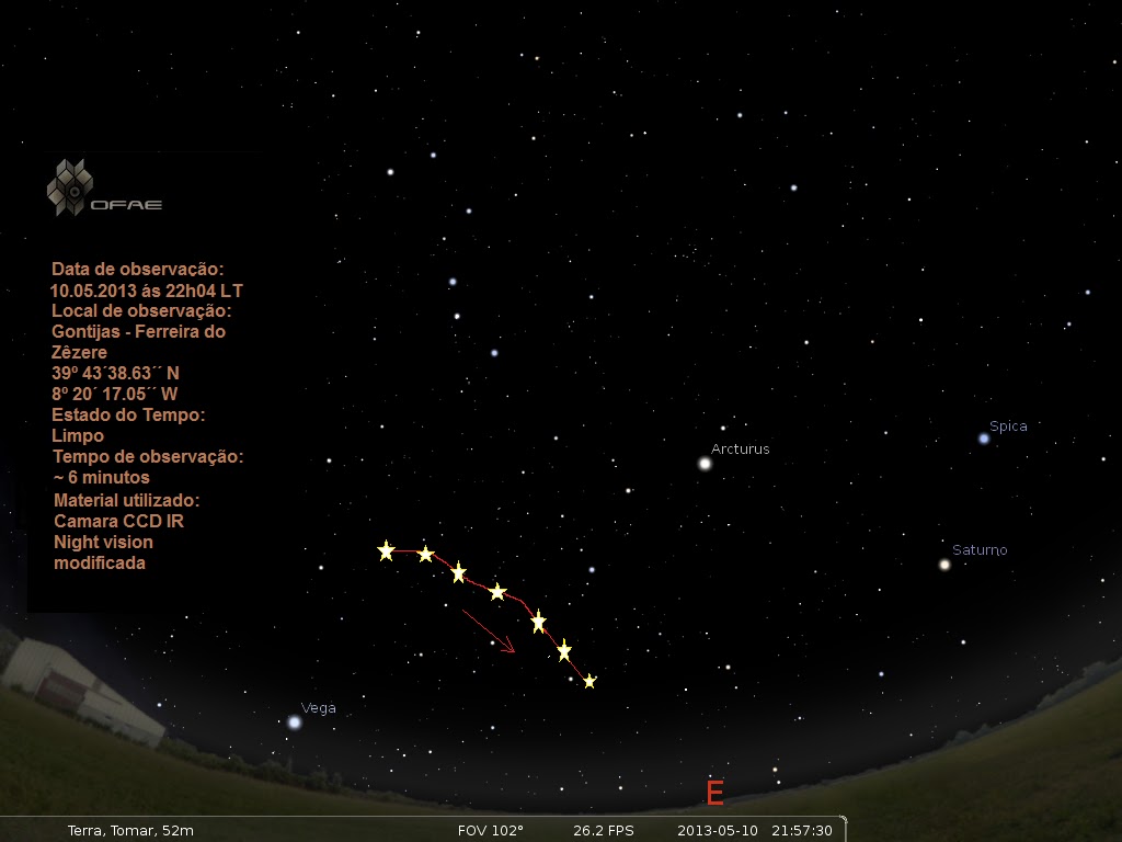 Entre Saturno e Spica, um objecto estacionário emitiu uma série de flashs, alguns deles não eram perceptíveis a olho nu. O objecto situava-se no momento, a Sul-Este.