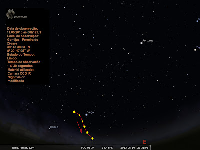 Após a observação de um objecto vindo de Norte-Oeste a média altitude ( acima dos 10 Kms ) a uma velocidade bastante elevada, um 2º objecto seguia o 1º a cerca de 15º de distância á mesma velocidade e descrevendo ambos a mesma trajectória linear, um atrás do outro, em direcção Sul-Este.
