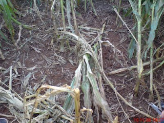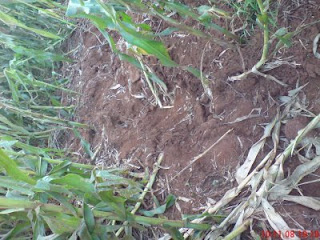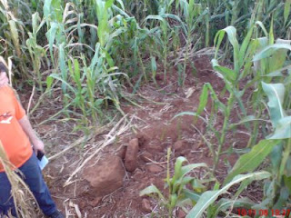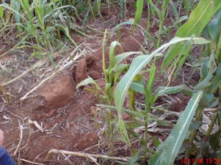 El epicentro fue ahí, como muestra en esa foto arriba, pero las ranhuras recorren varios metros por bajo de la plantación abriendo pequeñas crateras y derrumbando los pies de milho y, cuando no derrumbando, dejando su parte superior quemada.(foto abajo)